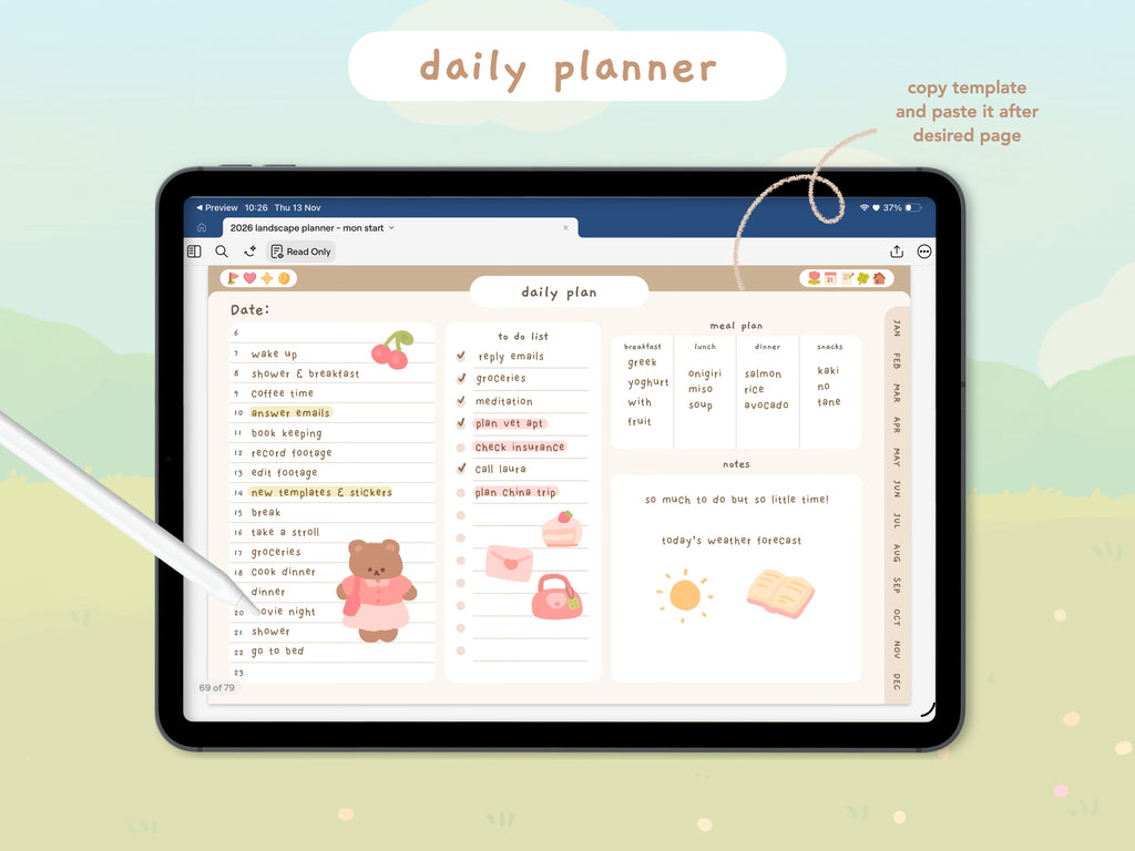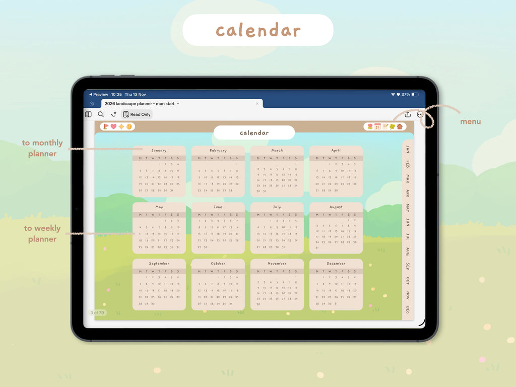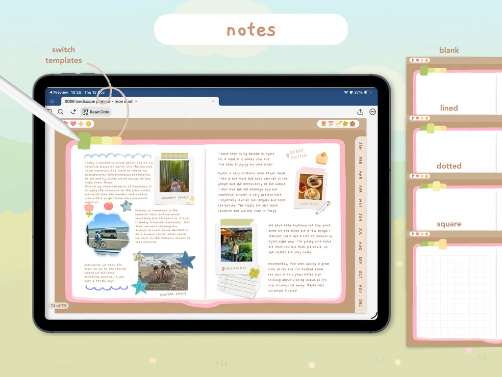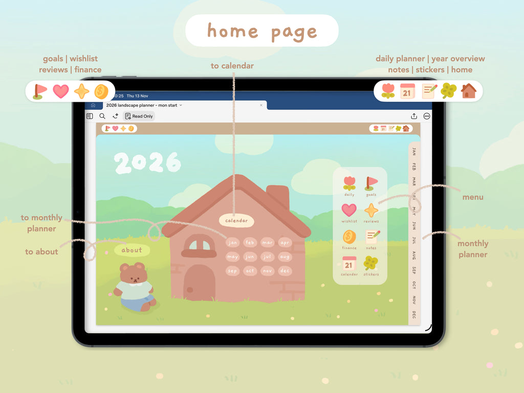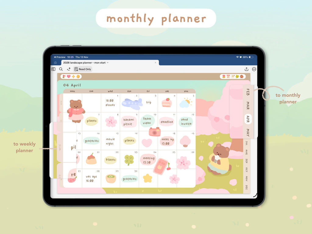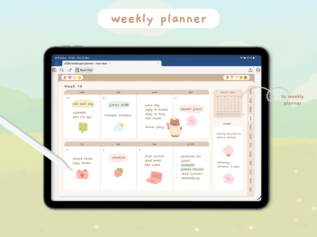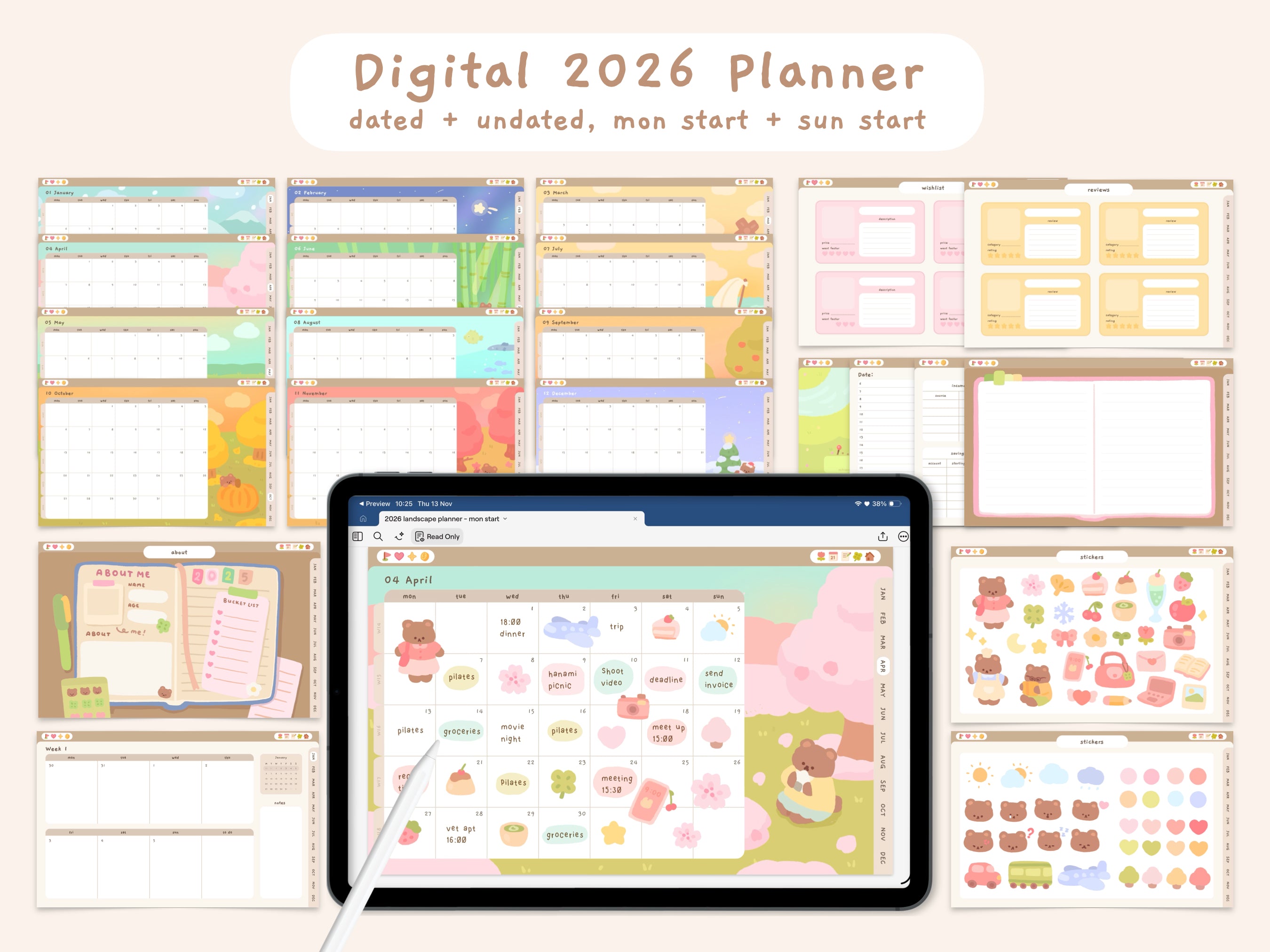 Create a memorable year with StudioCherii digital 2026 planner - landscape mode! Enjoy the seasonal monthly illustrations and create effective plans using the included templates and stickers! This planner features monthly and weekly hyperlinks for easy navigation between pages. Plus, an undated version is included, making it reusable year after year! Happy planning! ✍🏻🤍